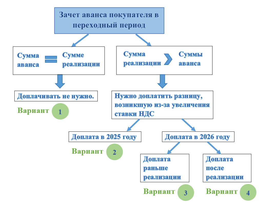 Получается, что при зачёте аванса покупателя в переходный период возможно несколько ситуаций, в каждой из которых свой порядок действий.