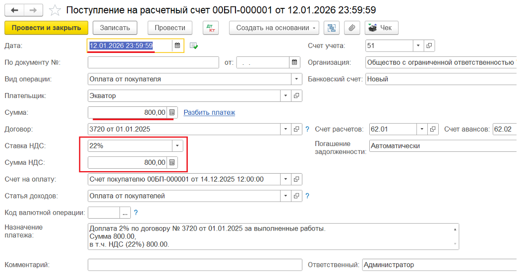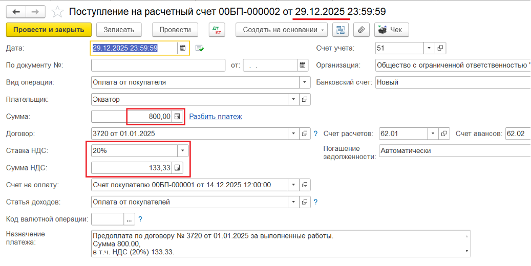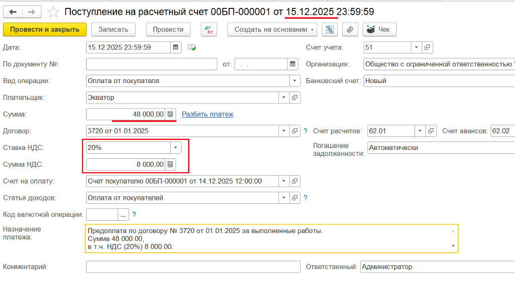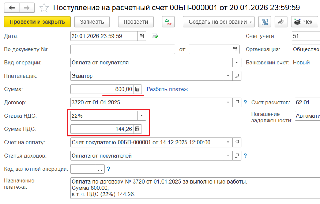 3️⃣ Поступление доплаты от покупателя в 2025 году — ввод документа «Поступление на р/с» на недостающую сумму, включающую НДС по ставке 20%: