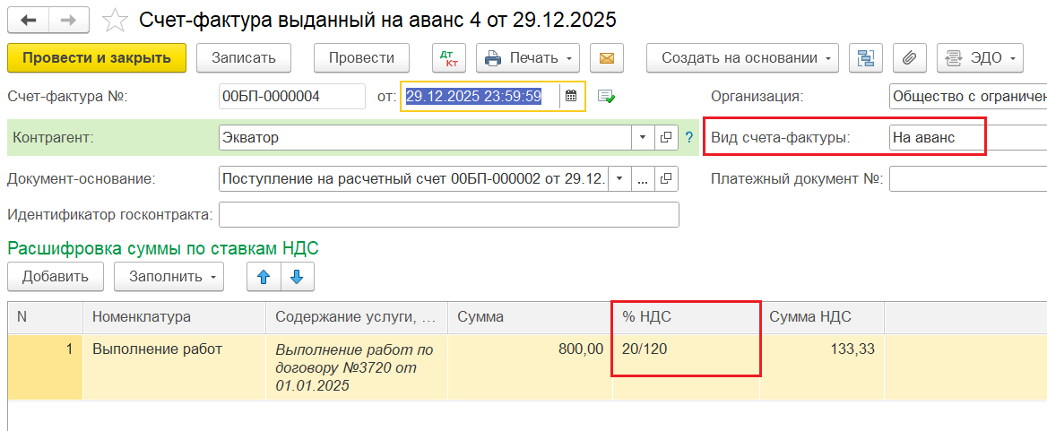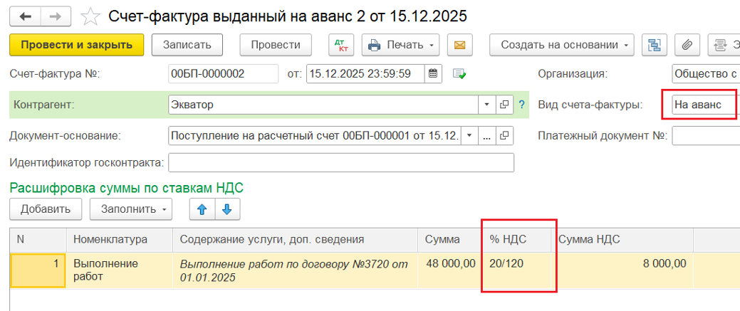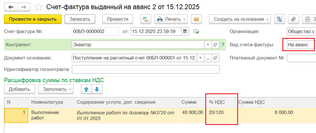 2️⃣ Создание авансового Счёта-фактуры на основании документа «Поступление на р/с» — ставка НДС 20/120%. Запись по нему попадёт в Книгу продаж в 2025 году.