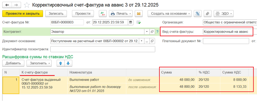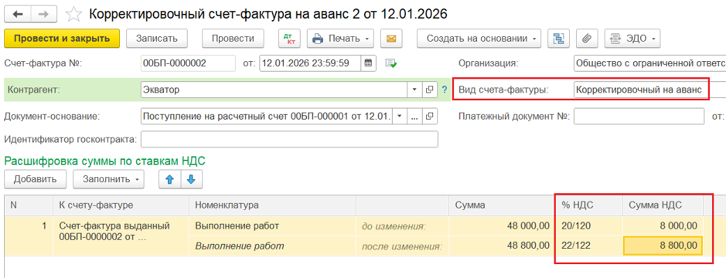 4️⃣ Создание корректировочного Счёта-фактуры на аванс на основании документа «Поступление на р/с» (доплата):