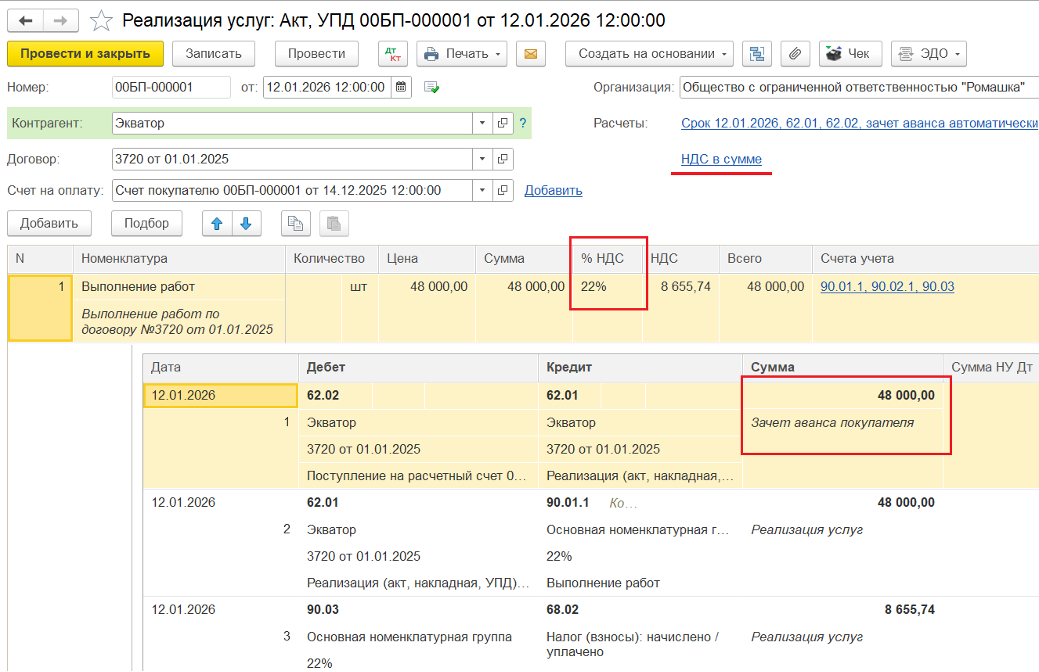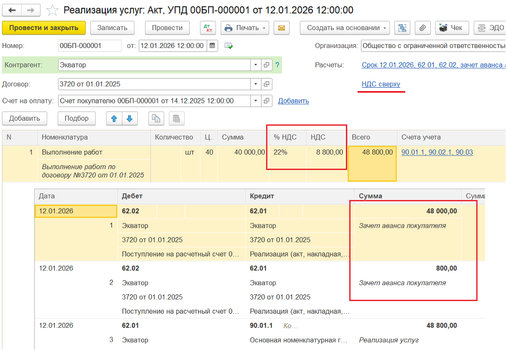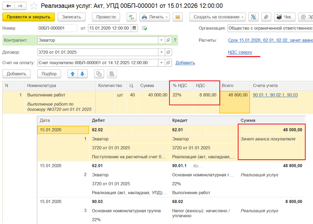 3️⃣ Реализация товаров/услуг в 2026 году — ввод документа «Реализация (акт, накладная, УПД)». Ставка НДС — 22%. Аванс покупателя при этом зачитывается частично: