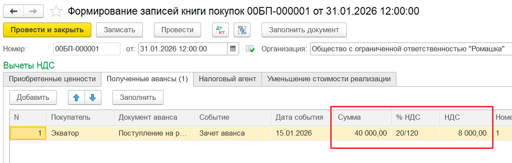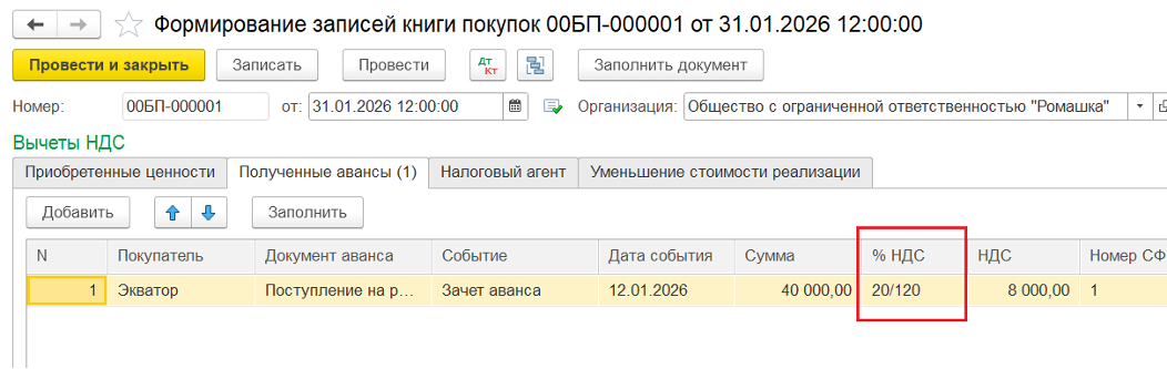 5️⃣ Восстановление НДС с аванса в Книге покупок — ввод документа «Формирование записей книги покупок». При этом зачитывается НДС по ставке 20/120%: