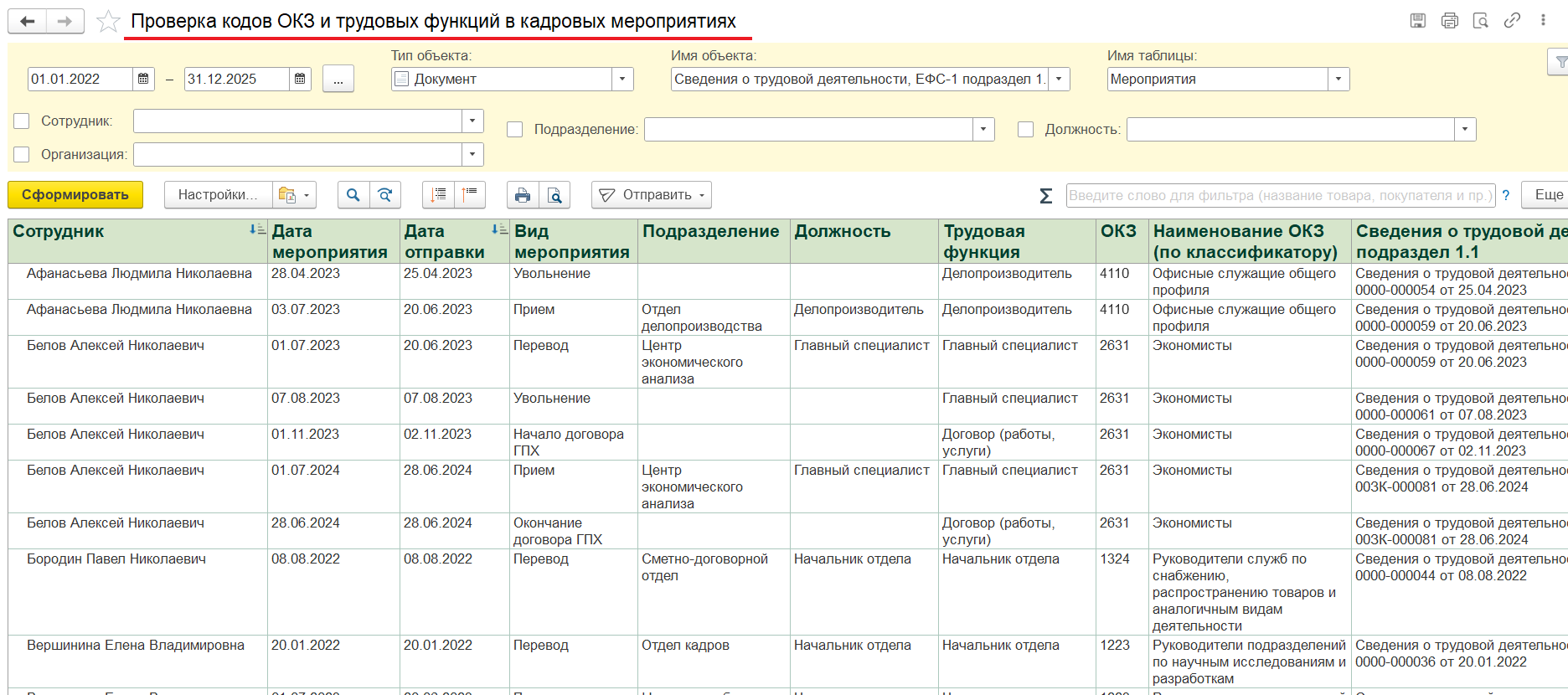 Для проверки можно использовать отчёт «Проверка кодов ОКЗ и трудовых функций в кадровых мероприятиях», сделанный на основании «Универсального отчета».