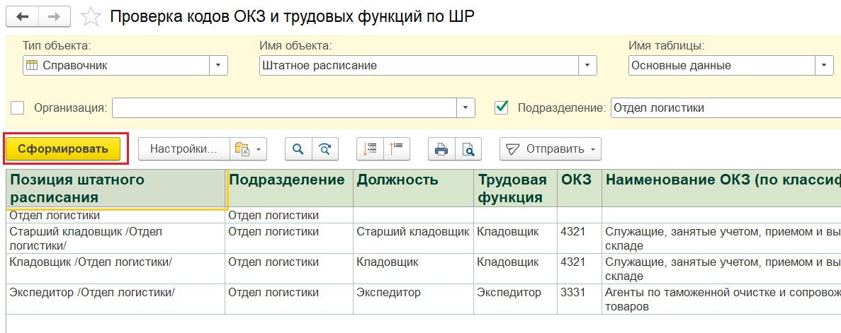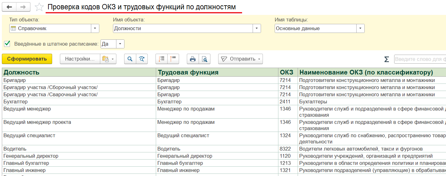 Правильность заполнения этих данных в ШР можно проверить с помощью донастроенного отчета «Проверка кодов ОКЗ и трудовых функций по ШР», сделанного на основании «Универсального отчета»: