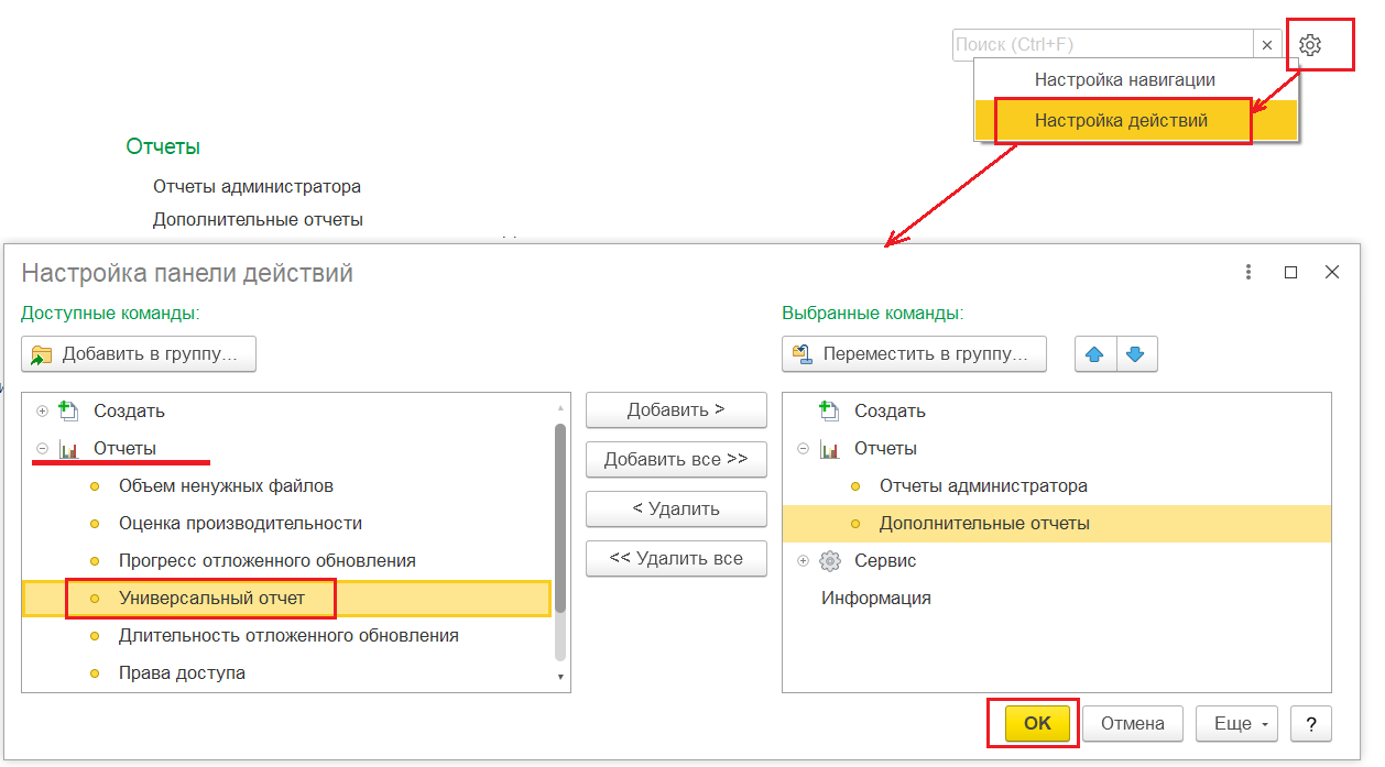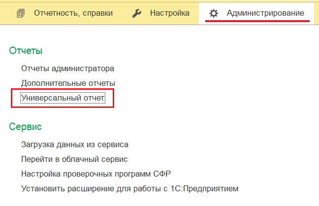 1. Открыть «Универсальный отчёт» в разделе «Администрирование»