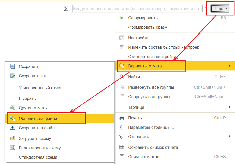 2. Загрузить настройки нужного отчета из файла через меню «Ещё — Вариант — Обновить из файла»: