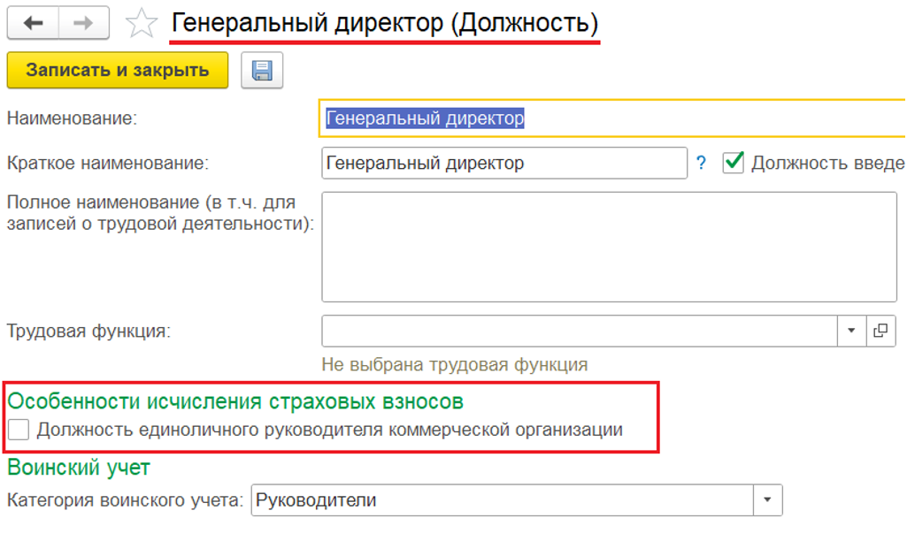 1️⃣ В справочнике «Должности» включить для должности руководителя новый «флажок» — «Должность единоличного руководителя коммерческой организации» для того, чтобы в дальнейшем для этой должности выполнялись проверка облагаемой базы. Например: