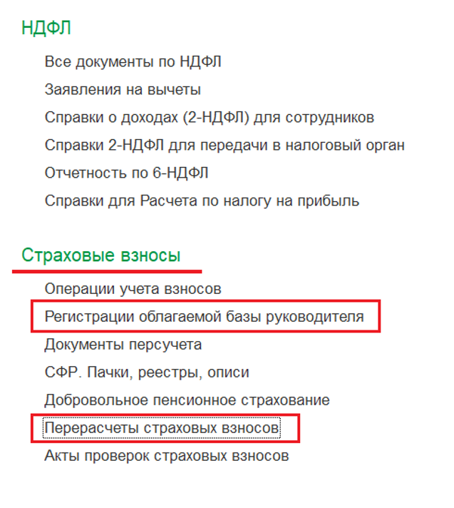 Документы, используемые при расчёте страховых взносов за руководителя, находятся в БП в разделе «Зарплата — Страховые взносы»: