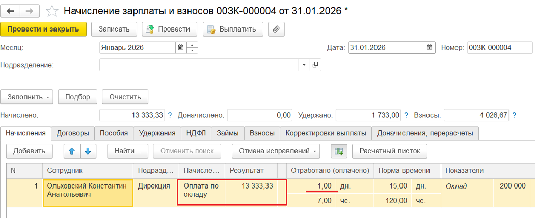 2️⃣ Выполнить начисление зарплаты по всем сотрудникам за месяц. Тогда для руководителя определится облагаемая база за месяц, и, если она окажется ниже МРОТ, то её потом нужно будет скорректировать. Например, руководитель был в отпуске и в текущем месяце отработал 1 день: