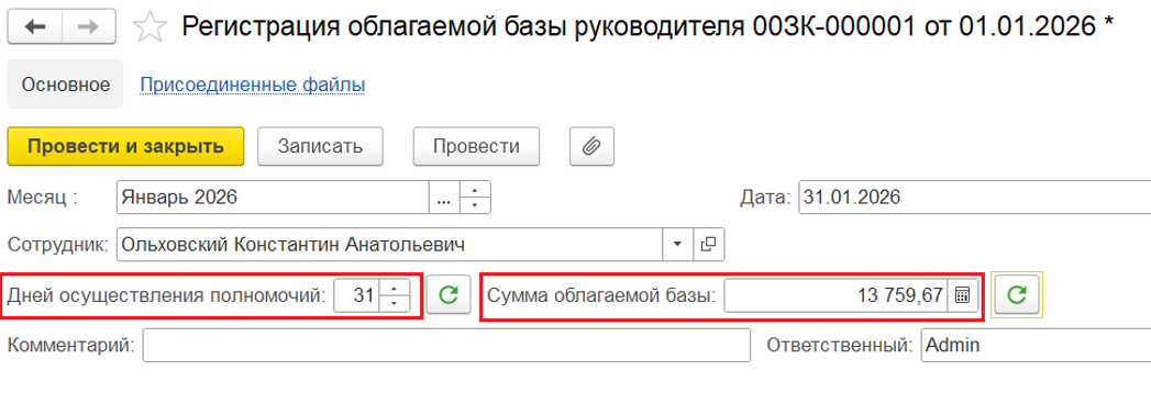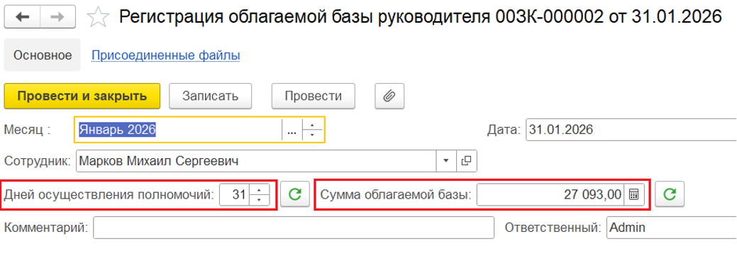 2️⃣ Ввести новый документ «Регистрация облагаемой базы руководителя», в котором выбрать этого сотрудника и вручную указать количество дней осуществления полномочий и сумму облагаемой базы, равную МРОТ. Провести этот документ. Например: