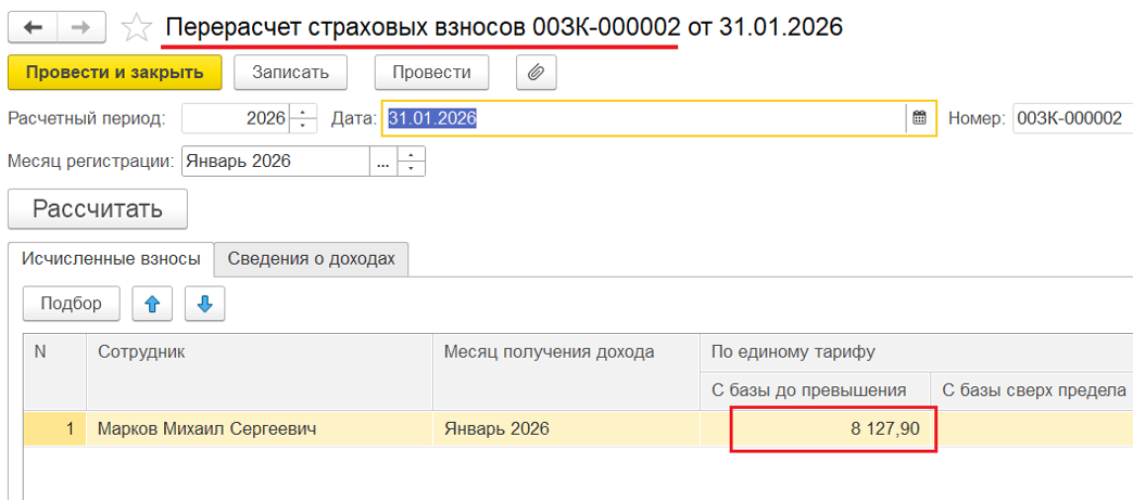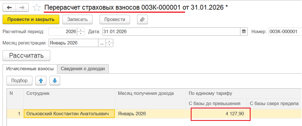3️⃣ Далее рассчитать страховые взносы руководителя с помощью документа «Перерасчёт страховых взносов», например:
