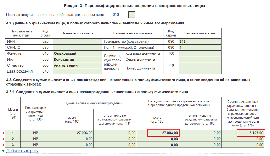 В результате в отчёт «Расчёт по страховым взносам» по этому сотруднику попадут следующие данные: