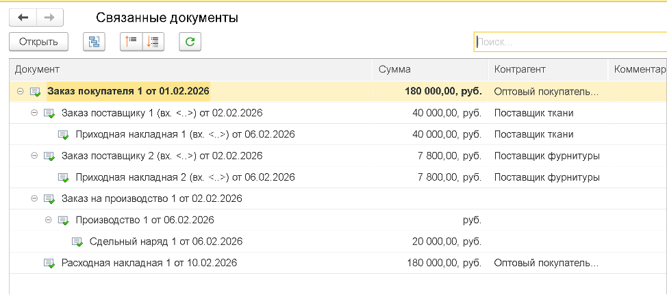 Сделаем для примера вот такую цепочку документов – Заказ покупателя, заказ поставщику, производство, сдельный наряд и расходную накладную