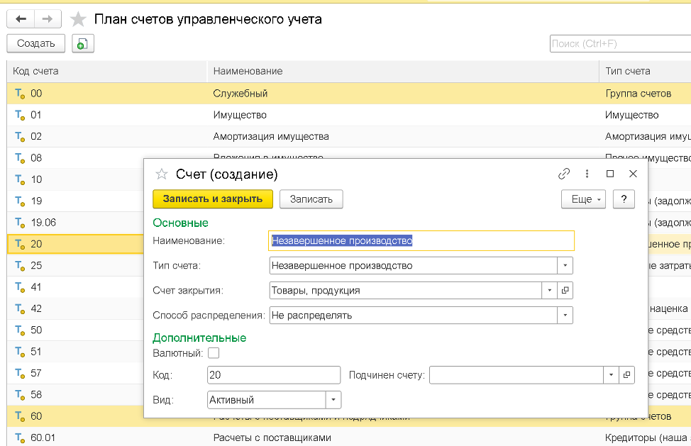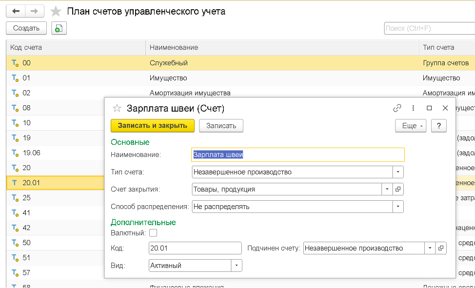 Скрин 6. Новый счет учета 20.01 – зарплата швеи