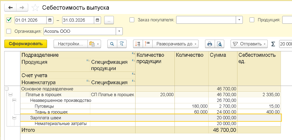 И вот типовой отчет Себестоимость выпуска покажет такие цифры: